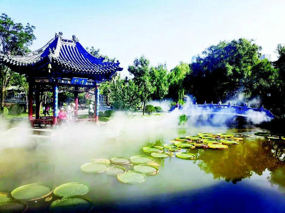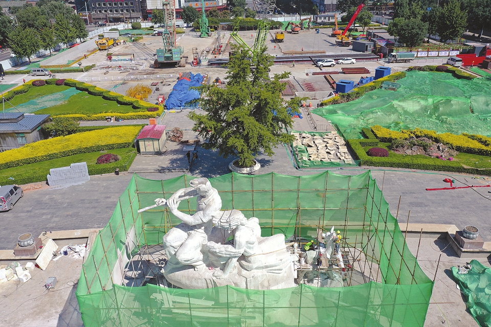 9月7日,位于寬銀幕電影院門前的人行天橋,施工人員正在安裝全新的玻璃護欄。