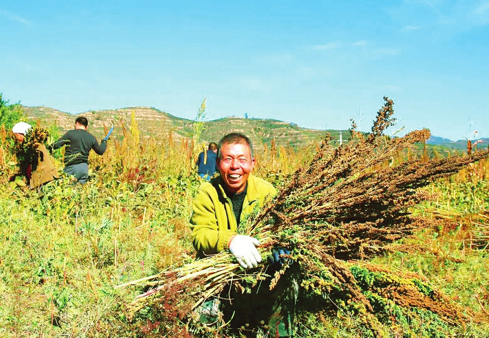 方山縣積翠鄉方山村貧困戶李來保捧著新收獲的藜麥笑容滿滿。肖繼旺 攝