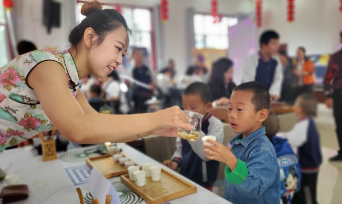 身著旗袍的老師正在進行茶道表演,一舉一動都是美的享受,大家靜靜地聽著、看著,在短暫的時光中,感悟博大精深的茶文化,進行一次心靈的清新之旅。當茶泡好了,大家捧起一杯,慢飲細酌。