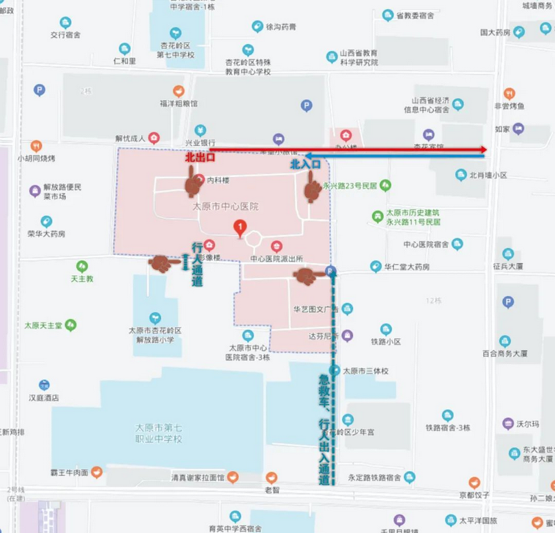 太原市中心醫院府城院區:山西省太原市杏花嶺區解放路東三道巷1號。