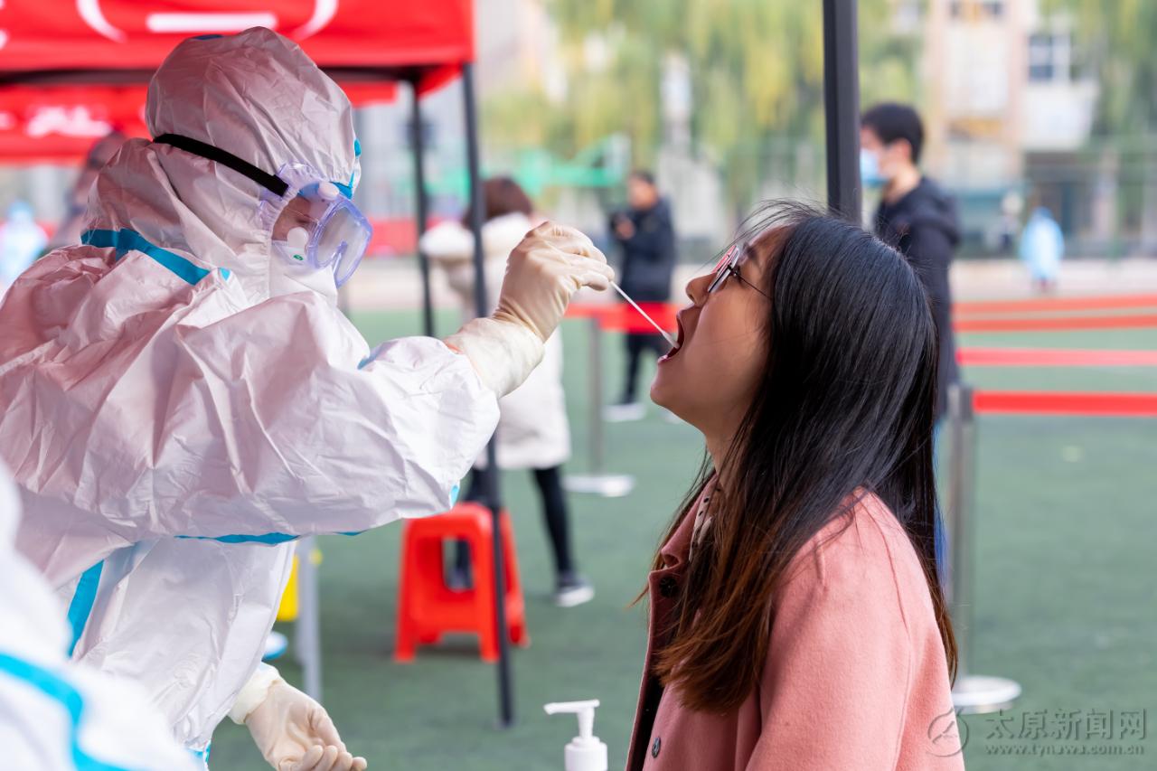 “頭部微仰,嘴張大,發‘啊’的聲音”,負責核酸檢測的工作人員耐心地囑咐著受檢人員。 11月5日下午,太原市全員新冠病毒核酸采樣檢測應急演練首先在迎澤區山西醫科大學校園采樣點舉行。