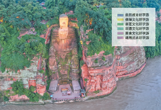 這些線路包含以“綠水青山,就是金山銀山”為主題的自然教育研學(xué)游,以“丹青山水,禪意嘉州”為主題的佛禪文化研學(xué)游,以“茶語禪心,悠然聽茗”為主題的茶文化研學(xué)游,以“學(xué)習(xí)技藝,傳承文化”為主題的非遺研學(xué)游,以“樂山味道,美食留香”為主題的美食文化研學(xué)游和以“武旅融合,行走自己的江湖”為主題的峨眉武術(shù)研學(xué)游。6條線路由點及面,將樂山的景區(qū)景點、美食美景,自然文化遺產(chǎn)和非遺文化等囊括其中。