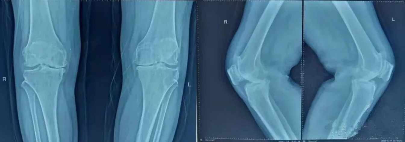 患者女性,61歲,主因“雙膝關節疼痛,活動受限10年余”入院。患者于10年余前無明顯誘因出現雙膝關節疼痛,活動受限,活動后癥狀加重,休息后癥狀可緩解。于當地醫院行關節腔注射玻璃酸鈉等對癥治療后癥狀緩解不明顯。現患者為求進一步診治,遂來我科就診。雙膝關節呈輕度內翻畸形,雙膝關節處未查及明顯壓痛。膝關節活動度:左:屈曲90°,伸直:-5°,右:屈曲90°,伸直:-10°。雙膝關節抽屜試驗,側方應力試驗,半月板旋轉擠壓試驗陰性。雙下肢未查及明顯感覺減退,雙側足背動脈搏動可觸及。