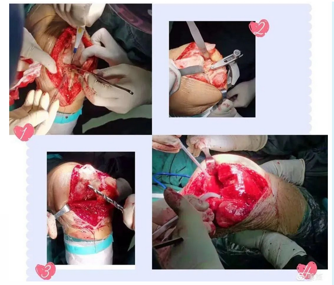 術中清理半月板及交叉韌帶,清理增生骨贅;脛骨髓外定位,脛骨截骨;股骨開髓股骨遠端截骨;前后髁及髁間截骨完成