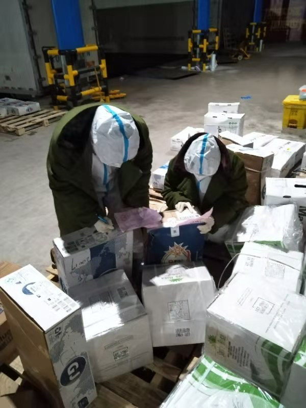 冷鏈食品檢疫工作環境特殊,只能在室外進行,被選派到一線的人員本著負責的態度,不畏嚴寒、克服困難,為了配合田和總倉的工作安排,常常在凌晨時分依然身著防護服堅守崗位。