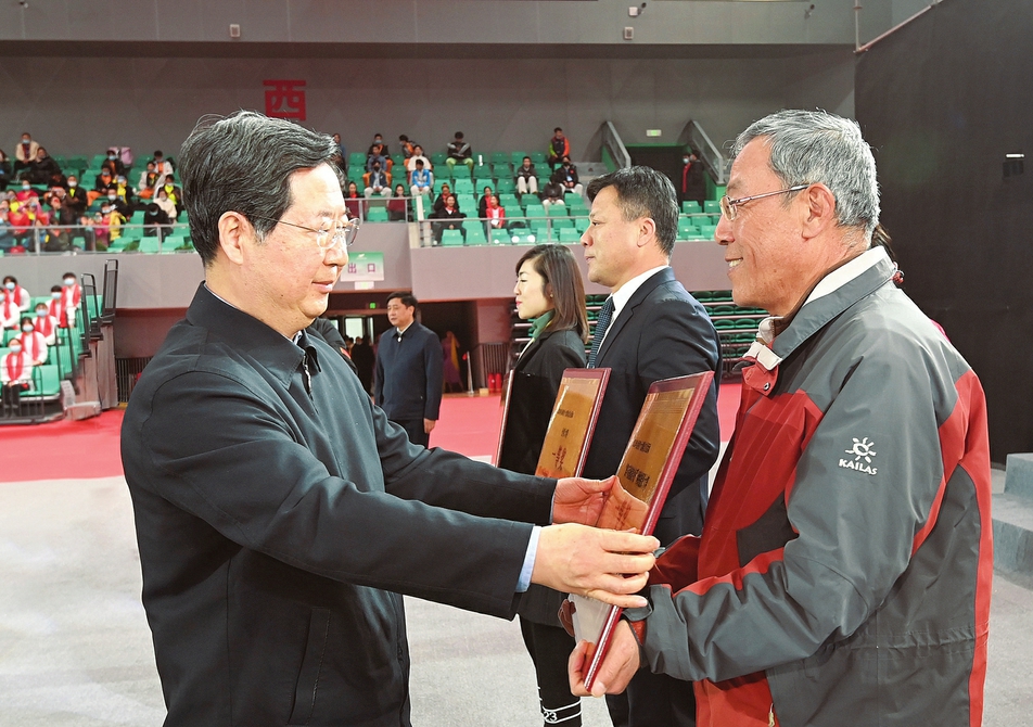 圖為省委書記、省人大常委會主任樓陽生出席山西省十大群眾文化活動閉幕式,并為獲獎團隊代表頒獎。史曉波攝
