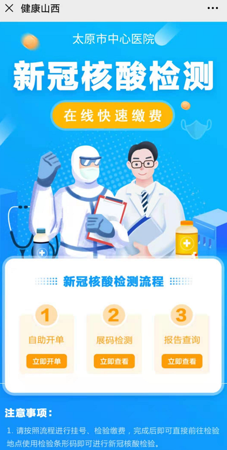 為了使“愿檢盡檢”人群核酸檢測更便捷,太原市中心醫院已開通“健康山西微服務”核酸檢測在線申請、繳費、查詢功能!