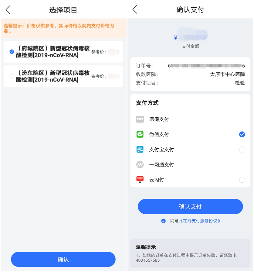 選擇院區。選定太原市中心醫院“府城院區”或“汾東院區”核酸采集處,并確認支付。