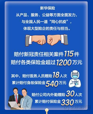面對2020年初突如其來的新冠肺炎疫情,新華保險從產品、服務、公益方面全面發力,與全國人民一道同心抗疫,體現了一家大型險企的責任和擔當。截至2020年底,公司累計賠付新冠責任相關案件115件,賠付各類保險金超1200萬元。其中,賠付醫務人員贈險18人次,累計賠付身故保險金540萬元;賠付公司內外勤贈險30人次,累計賠付保險金330萬元。