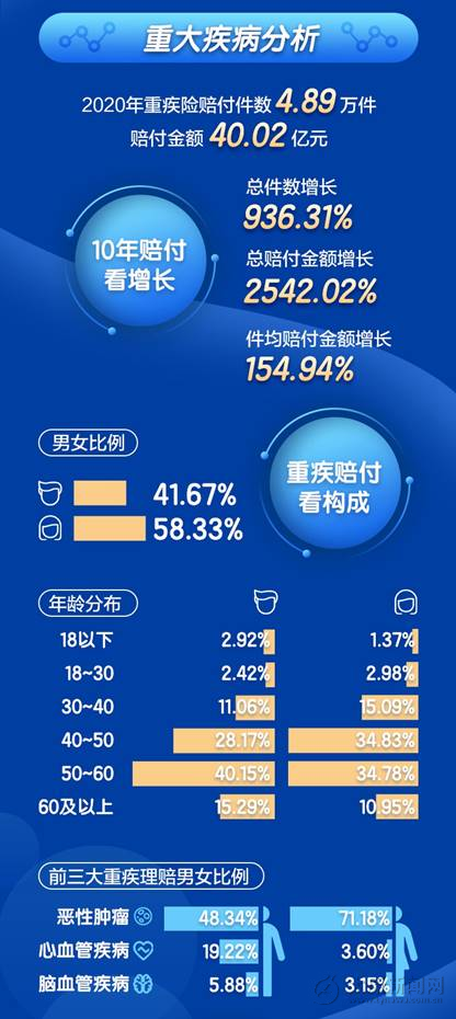 2020年,新華保險重疾險賠付件數4.89萬件、賠付金額40.02億元。通過對十年間的理賠數據分析,新華保險發現,重疾險賠付總件數及金額均大幅攀升,其中,總件數增長9倍,總賠付金額增長25倍,但件均賠付金額僅增長1.5倍,顯示重疾險件均保額仍有提升空間。