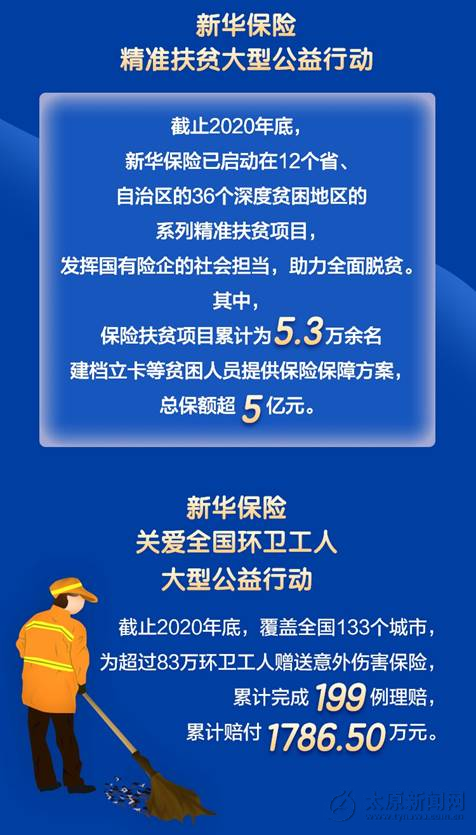 由新華人壽保險公益基金會發起的“關愛全國環衛工人大型公益行動”繼續深耕細作,截至2020年底,已覆蓋全國133個城市,為超過83萬名環衛工人贈送意外傷害保險,累計完成199例理賠,累計賠付1786.5萬元。