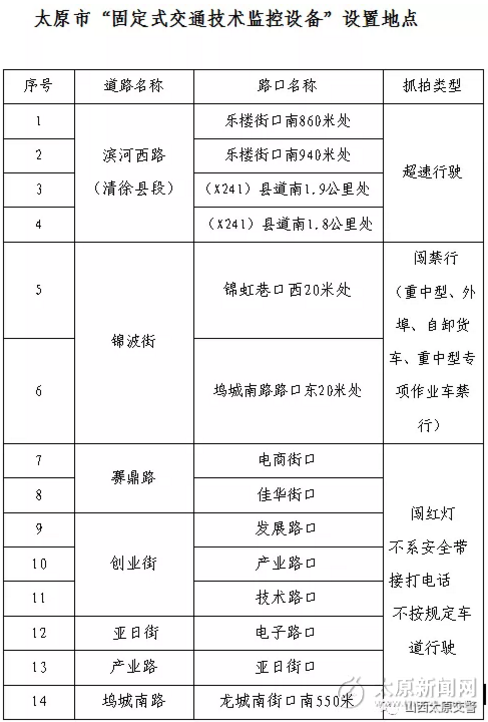 1月20日,記者從太原市交警支隊獲悉,近期,濱河西路、創業街路等14處交通監控設備已安裝、調試完畢,并經相關部門技術鑒定和驗收,現根據公安部部令第105號《道路交通安全違法行為處理程序規定》第十六條:“……固定式交通技術監控設備設置地點應當向社會公布”的規定,特向社會公布。
