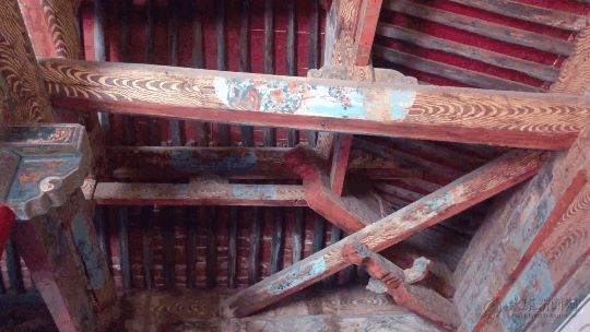 殿內(nèi)梁、枋、柱等用材碩大,屋架舉高甚陡,檐下施瀝粉貼金彩繪。