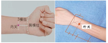 拇指放到內側,食指托住外關穴(在與手背內關穴相對的另一面),兩手指相互垂直齊用力下壓后用力再揉。
