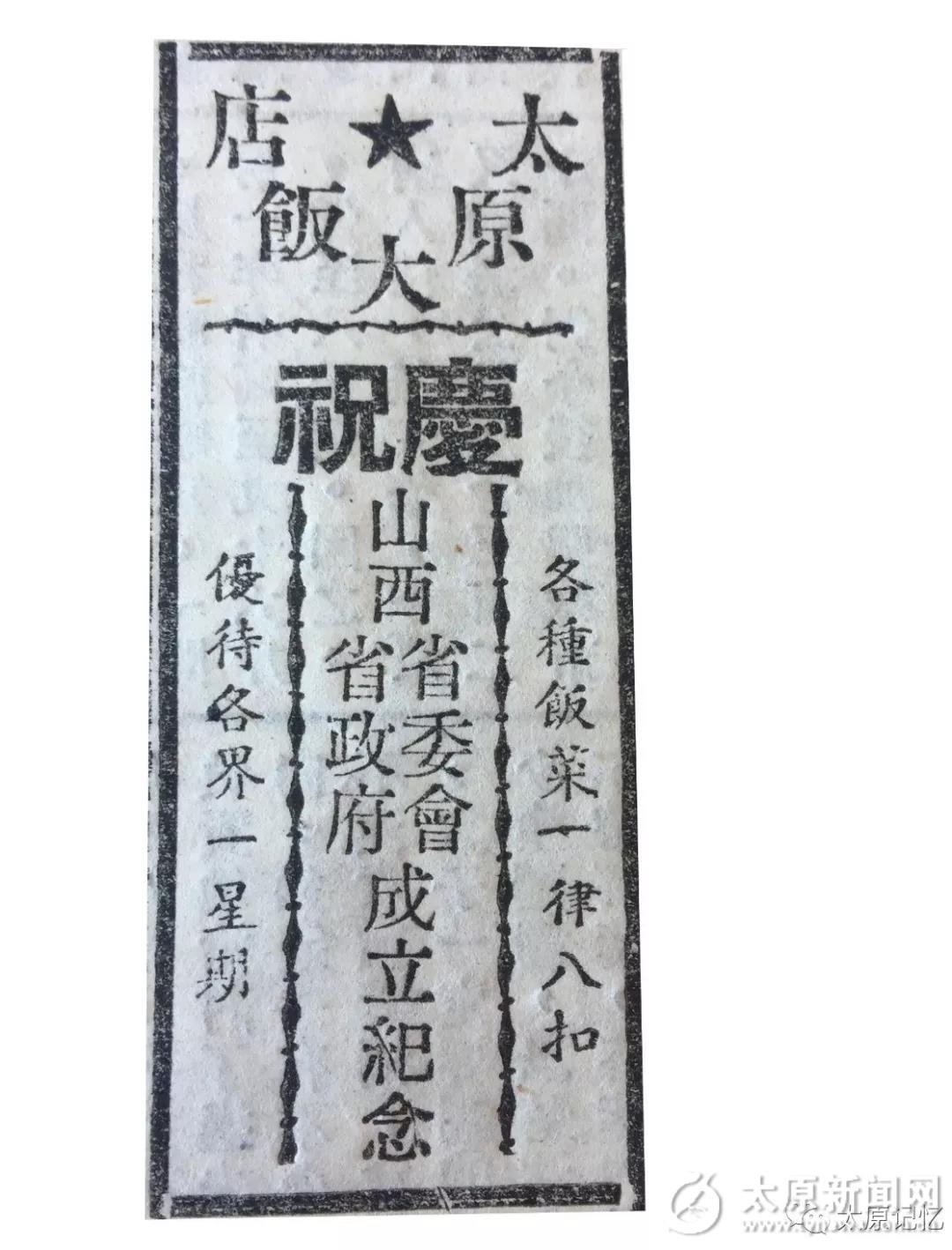 太原大飯店新張開(kāi)幕(《山西日?qǐng)?bào)》登載太原大飯店酬賓廣告)