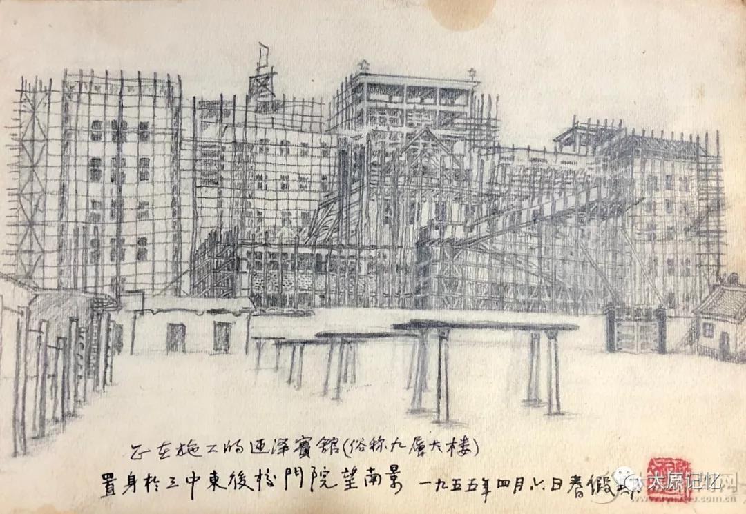 正在三中讀書(shū)的劉鈺畫(huà)下了建設(shè)中的迎澤賓館——當(dāng)時(shí)人們叫它九層大樓