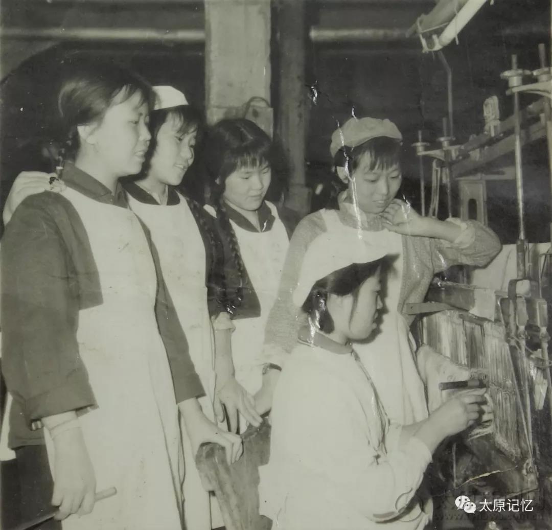 在太原紡織廠工作的張秋花(左二)與幾名青年突擊手正在一起交流操作技能,為車間舉辦的"紅五月高產日”做準備,以取得更好的成績。