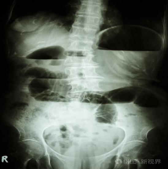 圖示:腸梗阻患者,可見腹部腸管擴張,并伴有大量高低不等的氣液平面,這是腸梗阻的典型表現。