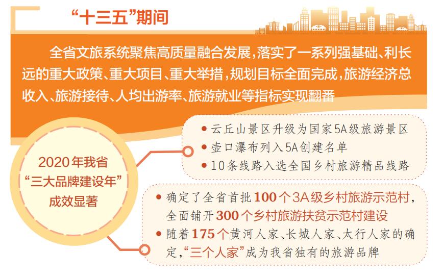 “游山西·讀歷史”成為山西文旅新形象;“黃河、長城、太行”三大旅游板塊享譽全國;文化惠民工程深入實施,一批優秀劇目獲國家級大獎;“文化+”“旅游+”新業態蓬勃發展……