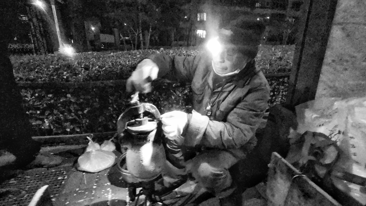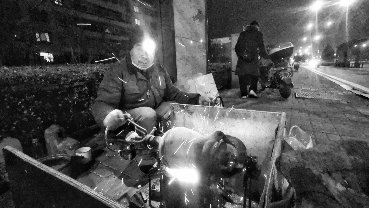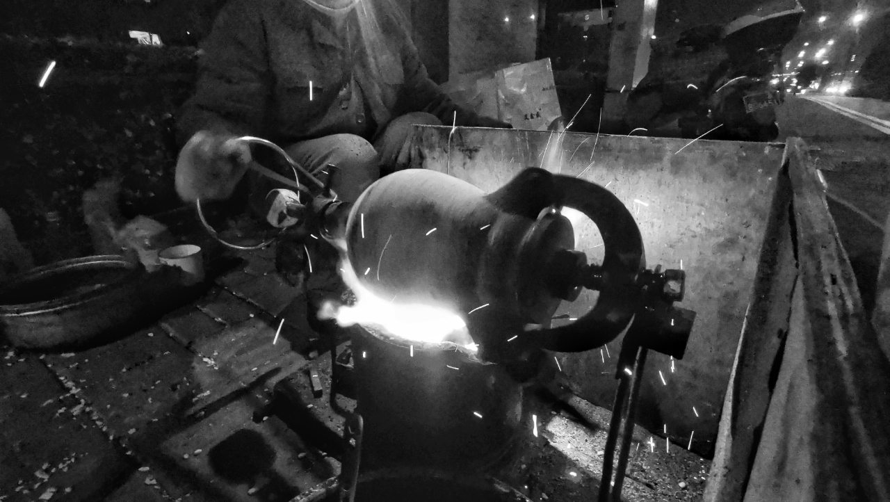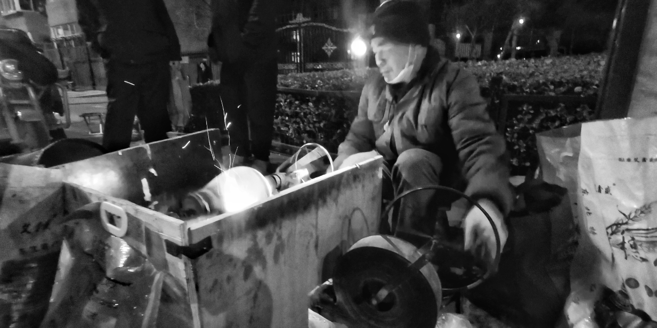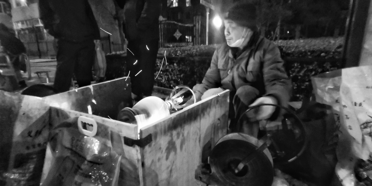 一團爐火、一個鼓風機、一臺葫蘆狀的爆米花機、自制的長筒麻袋……鍋里裝好玉米或者大米,師傅一只手轉動著鐵鍋的搖柄,另一只手搖著吹風機,還不時拿起鐵鉗,熟練地往火爐中添加煤炭,火爐在風機的作用下變得通紅。