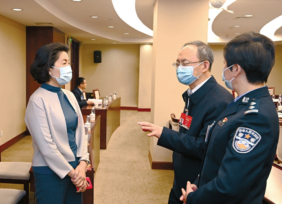 3月10日,山西代表團小組會議間隙,我省代表(左起)楊勤榮、王文保、李秋喜、郝旭、李桂琴在一起分享兩會有關經濟發展、依法治國、社會保障等熱點話題。