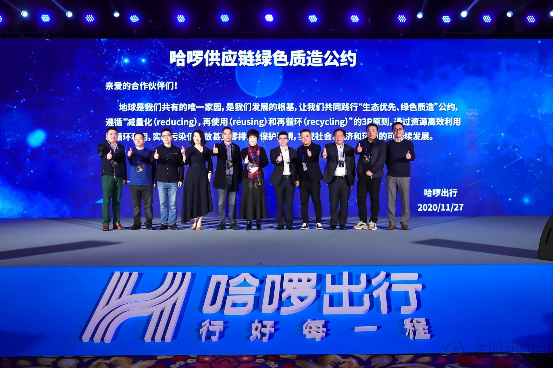 圖片說明:2020年11月,在兩輪出行產業高峰論壇上,哈啰出行面向400余家生態伙伴發起“綠色質造公約”,倡導踐行“生態優先、綠色質造”,遵循減量化(reducing)、再使用(reusing)和再循環(recycling)的3R原則,通過資源高效利用和循環利用,實現社會、經濟和環境的可持續發展。?