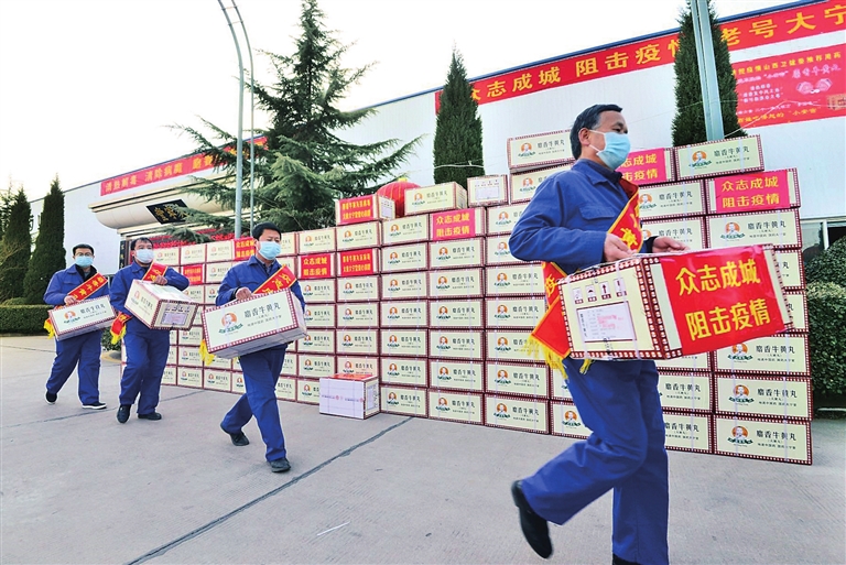 農(nóng)歷正月初二上午,大寧堂與山西紅十字會聯(lián)合舉行捐獻儀式;農(nóng)歷正月初二下午,大寧堂人火速奔赴機場,慰問援鄂人員,將小安宮麝香牛黃丸送到醫(yī)護人員手里;農(nóng)歷正月初四晚7時,滿載大寧堂鎮(zhèn)堂之寶小安宮麝香牛黃丸的兩輛貨車,從大寧堂出發(fā),奔向武漢;農(nóng)歷正月初六下午,12萬盒、價值921萬元的抗疫藥品抵達武漢。對大寧堂的義舉,武漢紅十字會深表感激。