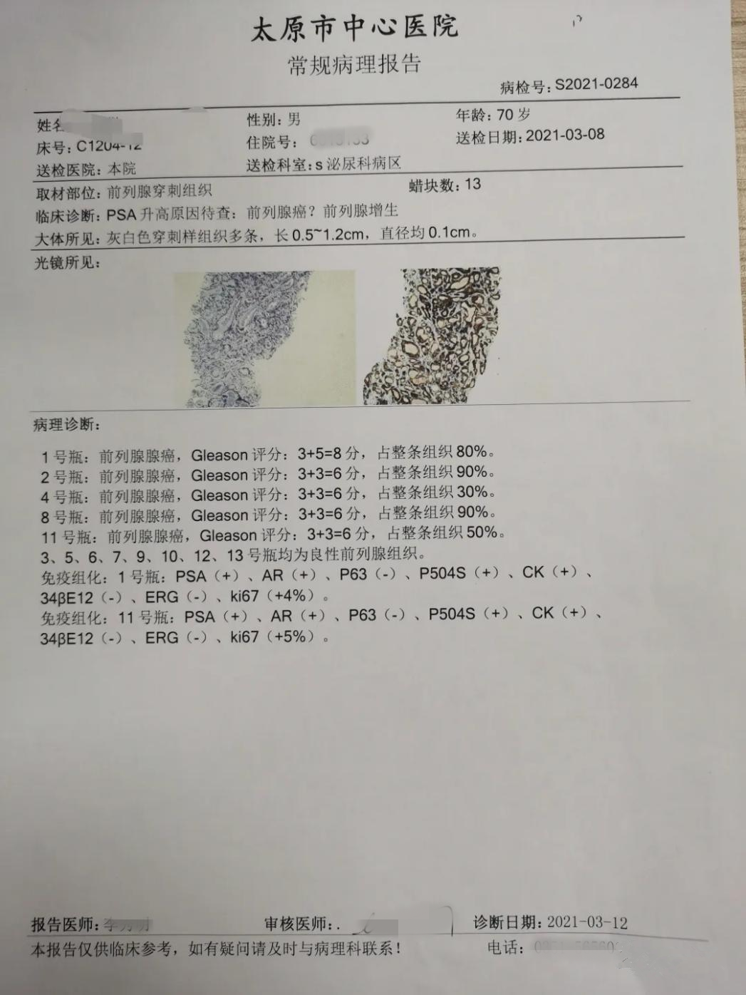 70歲的張大伯,兩周前在常規體檢時,發現PSA(前列腺特異性抗原前列腺癌的腫瘤標志物)36.38ng/ml(參考范圍<4ng/ml),看到檢查結果腫瘤標志物高出標準這么多倍,張大爺直奔太原市中心醫院泌尿科門診。