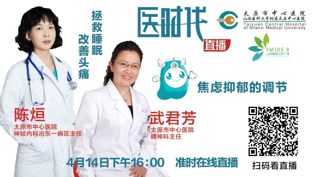本期(4月14日)《醫時代直播》邀請到太原市中心醫院神經內科汾東一病區主任陳烜、精神科主任武君芳,分別帶來主題為“拯救睡眠改善頭痛”“焦慮抑郁的調節”直播講解。直播從睡眠節律的養成、如何營造良好的睡眠環境、頭痛的分類及治療、如何識別抑郁癥、焦慮抑郁如何治療等方面,讓廣大患者享有科學評估和專業干預,把健康的生活習慣和好的心態融入生活和工作中,從而改善專注度、調解情緒、放松壓力、改善頭痛、失眠問題!