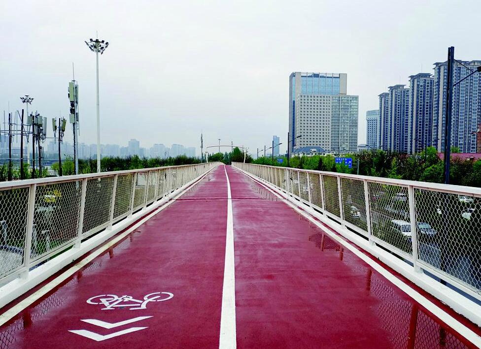 高架橋的兩側(cè)配以鏤空樹枝造型的奶白色防護(hù)欄,1.4米高的防護(hù)欄可以確保騎行人的安全。寬度為5米的橋面上,與平路一樣采用了提升安全性能的彩色涂層,一條專用道靜靜鑲嵌于汾河岸邊,與周圍的生態(tài)環(huán)境和諧地融為一體。