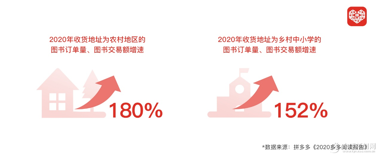 ▲《2020多多閱讀報告》顯示,去年有超過4億人次的讀者通過拼多多“拼”知識,來自農村地區的圖書訂單量和交易額同比增長雙雙超過180%,其中收貨地址為鄉村中小學的圖書訂單量、圖書交易額增速也都突破了152%。