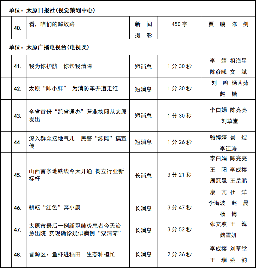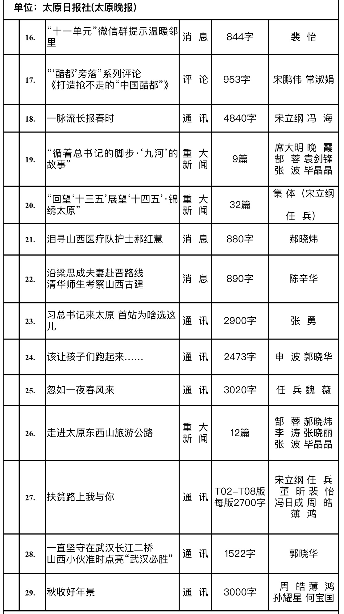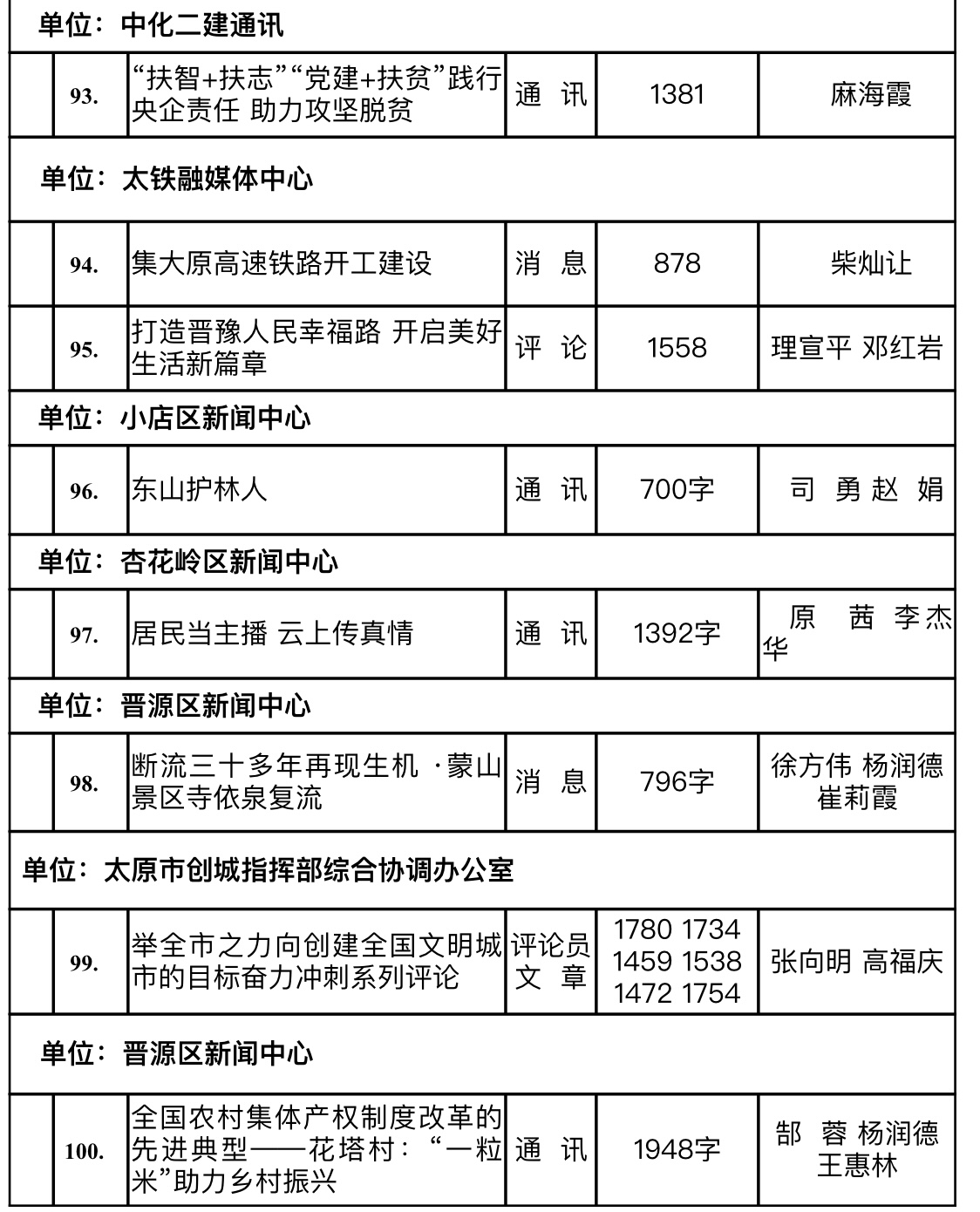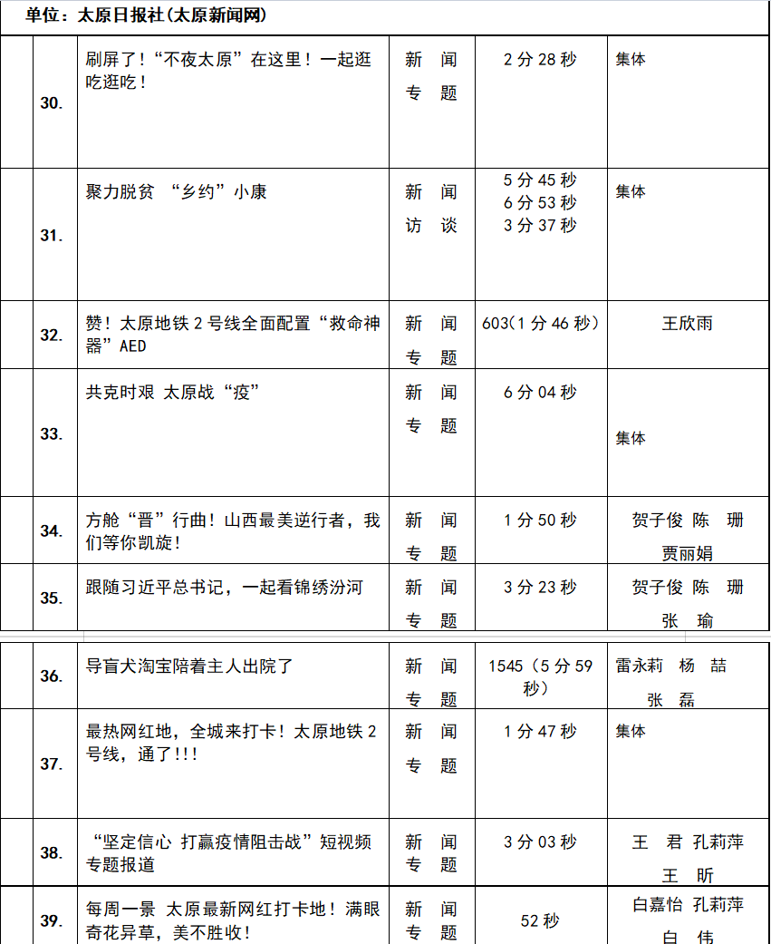 第三十屆(2020年度)太原新聞獎100件入圍作品公示目錄表