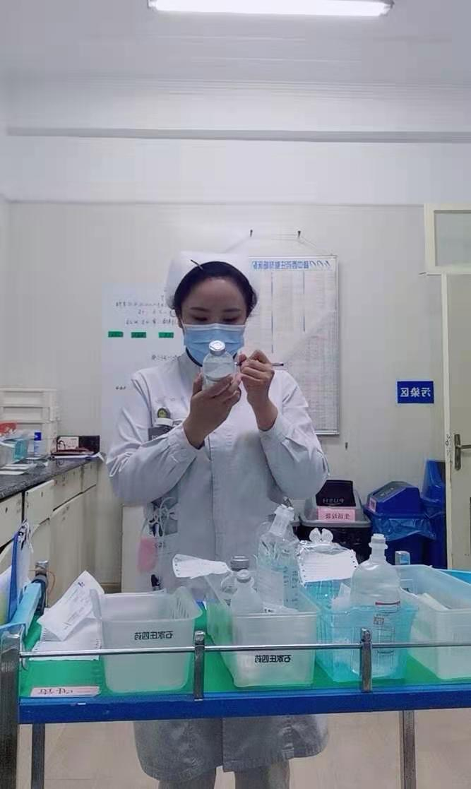 走進治療室,護士琨琨正整齊地擺放液體,反復查對,以確保配制的每一步液體都毫無差錯。針對每位患者的口服藥,她認真與醫囑核對,反復與醫生核對。她是我們護理工作確保安全的第一步,也是重中之重!