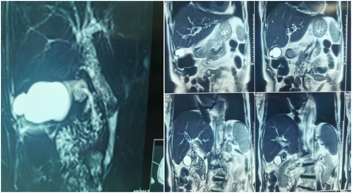 剛入院時,代奶奶體溫高達39.5℃,并且腹痛進行性加重,皮膚及鞏膜變黃,尿液濃茶水樣。代奶奶病情惡化非常迅速,主治醫生遂即給予胸部CT:雙肺間質性改變,肺氣腫伴右肺中下野感染;MRCP檢查回報:急性膽囊炎、膽囊結石頸部嵌頓、膽總管多發結石、急性膽管炎、腹水等。