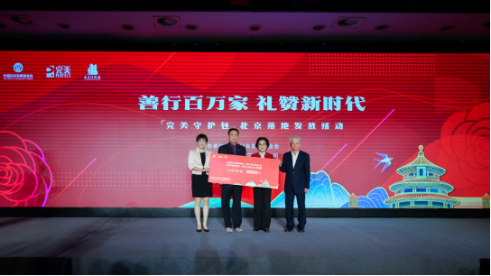 中國婦女發展基金會理事長甄硯、完美公司董事長古潤金向東城區婦聯、東直門街道遞交了捐贈牌,共捐贈“完美守護包”2000個