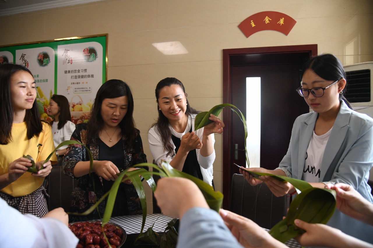 “先把三片葉子有層次地疊放整齊,然后卷成錐形,放一層米、加幾粒棗,再放一層米……”“一定要裹緊、壓實,一個好看的粽子要有四個尖尖角。”活動現場,大家分享著自己包粽子的經驗,在歡聲笑語中,體驗節日習俗,傳承傳統技藝,感受著濃濃的魚水之情。