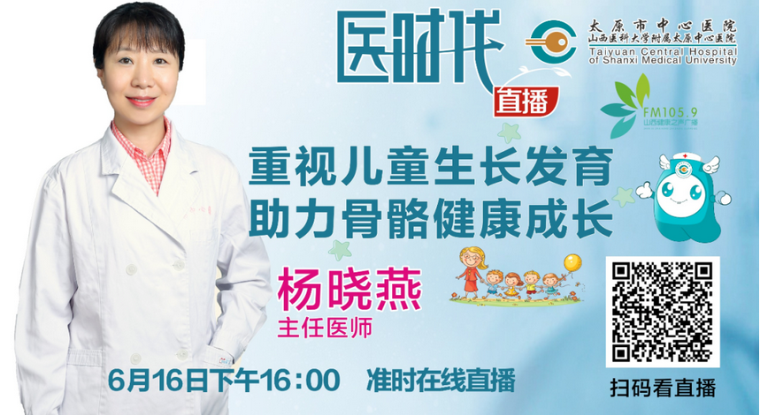 6月16日下午16:00,《醫時代直播》邀請到太原市中心醫院內分泌科主任醫師楊曉燕,為大家帶來主題為“重視兒童生長發育,助力骨骼健康成長”互動直播。從兒童正常的生長發育規律、掌握兒童的生長速率、影響兒童身高的因素、家長常見的誤區等方面,講解兒童生長發育相關問題,幫助家長正確判斷孩子的生長速度,助力兒童骨骼健康成長。