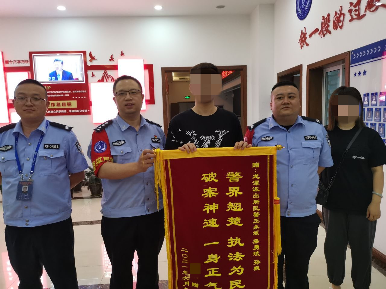 6月10日晚,龍?zhí)遁爡^(qū)居民翟某將一面印有“警界翹楚 執(zhí)法為民 破案神速 一身正氣”的錦旗送到公安杏花嶺分局龍?zhí)杜沙鏊瑢γ窬瘞推湔一貎r值一萬二千元的蘋果手機表示感謝。