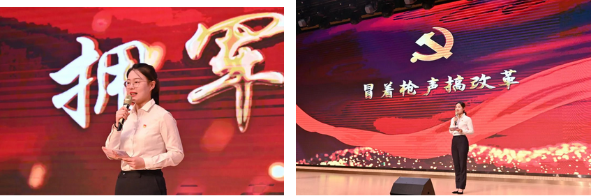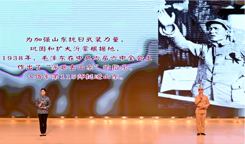“沂蒙精神”宣講團成員采用藝術黨課的形式,通過影像融合、情景再現、角色扮演等藝術方式,為大家帶來一場全新的紅色沂蒙藝術黨課。通過“黨群心連心”“擁軍勇支前”“日月換新天”“時代譜新章”四個篇章講述了“沂蒙紅嫂”英勇支前、女兒橋、永遠的新娘李風蘭以及萊蕪戰役、孟良崮戰役、淮海戰役中涌現出的舍死忘生的革命前輩,到解放初期戰嚴寒斗酷暑的改造淮河大會戰和九間棚村闖市場的不屈精神,再到改革開放后“時代楷模趙志全”勇立潮頭等不同時代的紅色故事,生動詮釋了黨群、軍民“水乳交融、生死與共”的沂蒙精神。