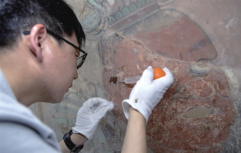 2016年6月,敦煌研究院文物保護技術服務中心對永樂宮壁畫進行詳細勘查,發現永樂宮壁畫存在顏料層起甲、脫落、粉化等病害問題。2019年經國家文物局批準,敦煌研究院文物保護技術服務中心先期開展永樂宮龍虎殿部分壁畫試驗性修復工作。