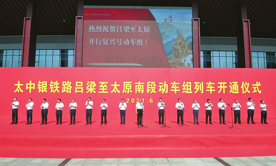 在慶祝中國共產(chǎn)黨成立100周年之際,我省客運通道建設(shè)再次收獲新的重要成果。6月26日上午,太中銀鐵路呂梁至太原南段動車組列車開通儀式在呂梁火車站舉行。省委書記、省人大常委會主任林武出席并宣布開通。省委副書記、省長藍佛安講話。省委常委、秘書長李鳳岐出席。副省長韋韜主持。