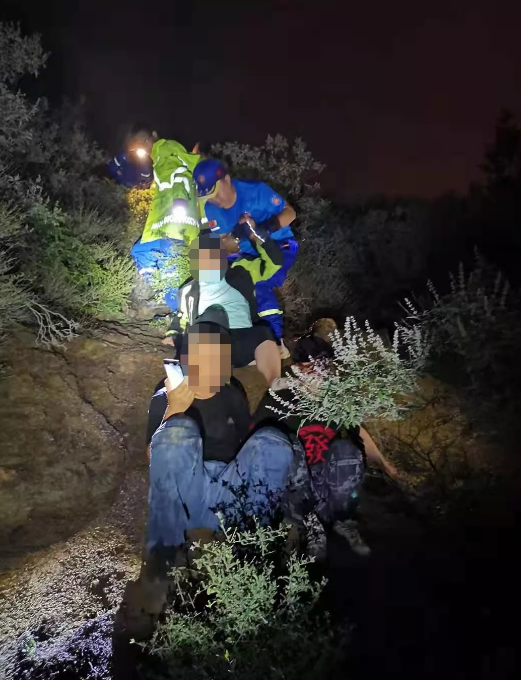 漆黑的夜晚,山路陡峭,民警、藍天救援隊、消防隊還有村民沿著失蹤游客所在的方向一邊喊一邊搜救,耗時兩小時,終于聽到了他們的求救聲。民警讓其打開手電筒,想通過燈光尋找其具體方位,結果根本看不見他們的燈光,救援人員只能按照聲音尋找,山上空曠,一時難以確定具體位置,只能分頭慢慢找,又過了一小時,經過不斷縮小范圍,歷經七小時,終于找到了4名游客,其中兩名游客還是孕婦,她們流著淚激動地說著:“終于找到了,終于找到了,太感謝你們了!”
