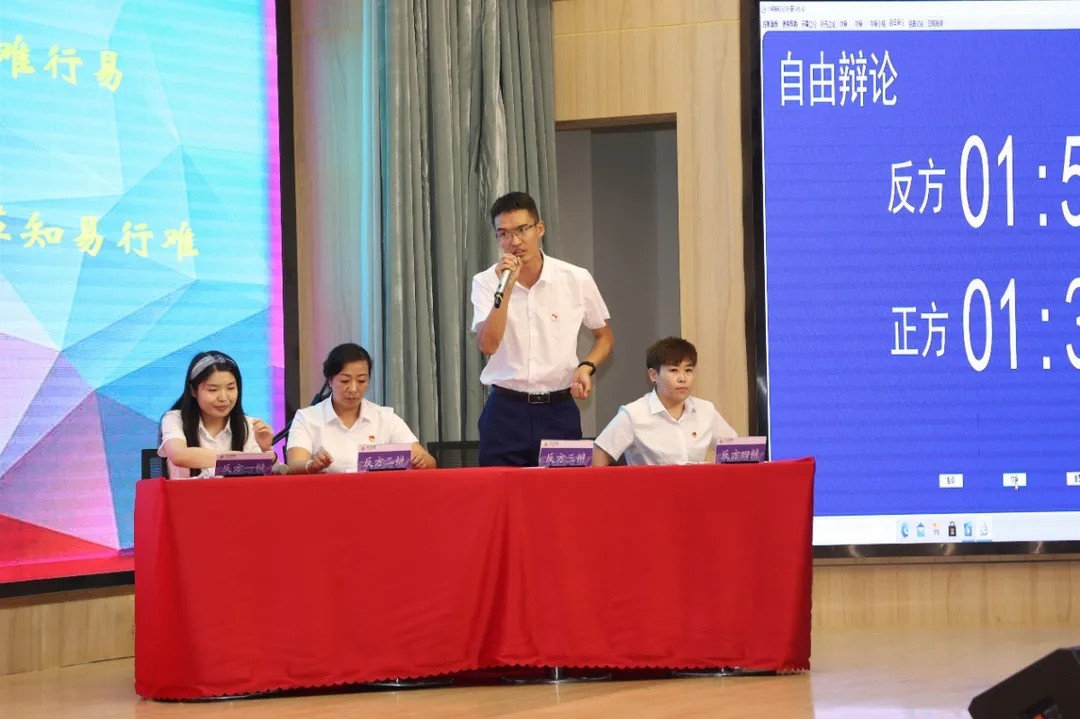 第二環節的師生辯論賽總決賽分為兩場總決賽,分別是教師辯論賽總決賽,辯題為“學校教學改革知難行易還是知易行難”;學生辯論賽總決賽,辯題為“小學生成長過程中更應該學會競爭還是更應該學會合作”。臺上正反方交鋒激烈,臺下掌聲此起彼伏,老師的點評切中肯綮,大眾評委現場舉牌,辯論賽主席的當場宣布結果激動人心。