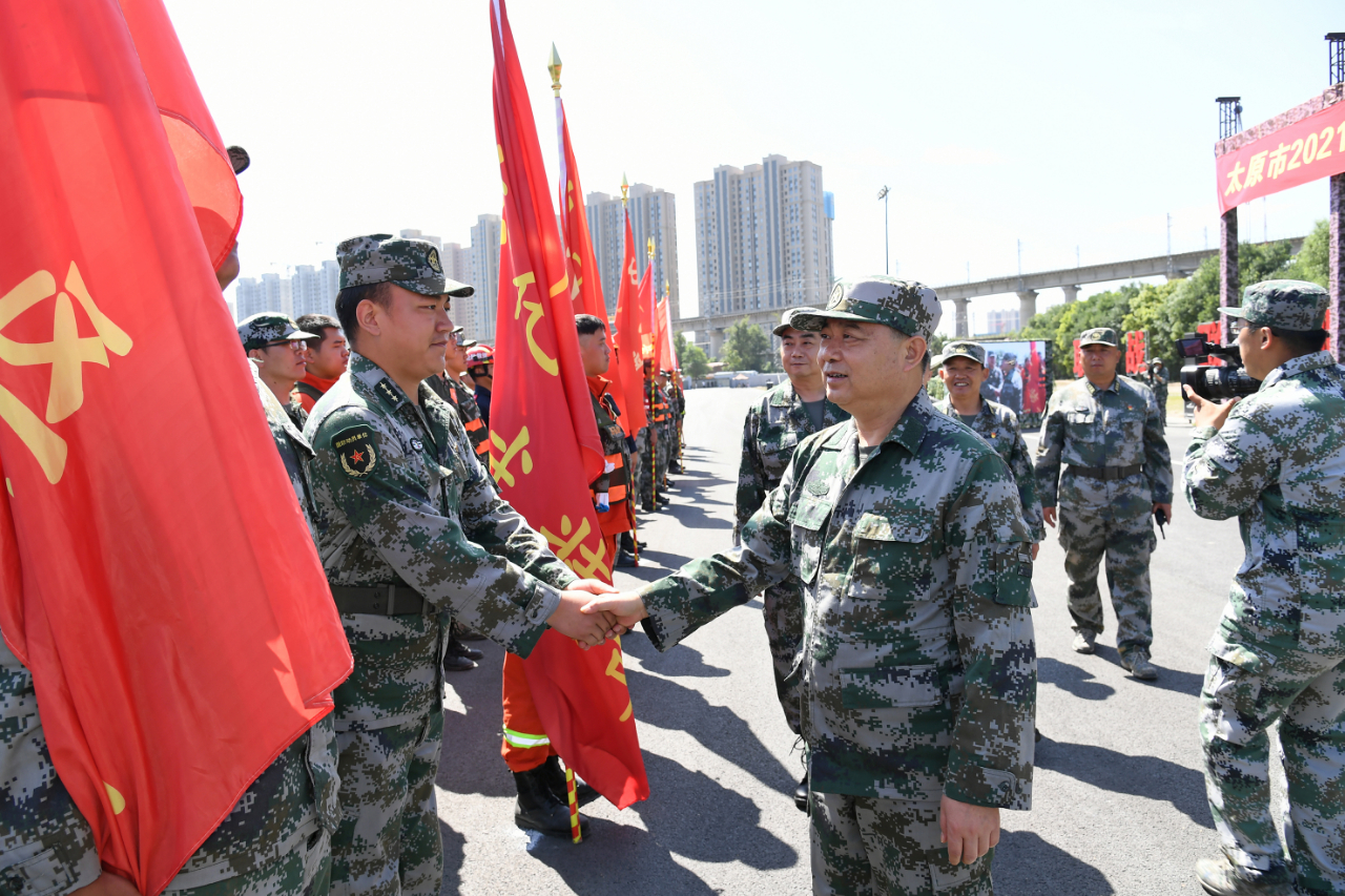圖為省委常委、市委書記、太原警備區(qū)黨委第一書記、市國防動員委員會第一主任羅清宇,市委副書記、市長、市國防動員委員會主任張新偉慰問參加太原市軍地聯(lián)合應(yīng)急應(yīng)戰(zhàn)課題綜合演練人員。梁琛 攝