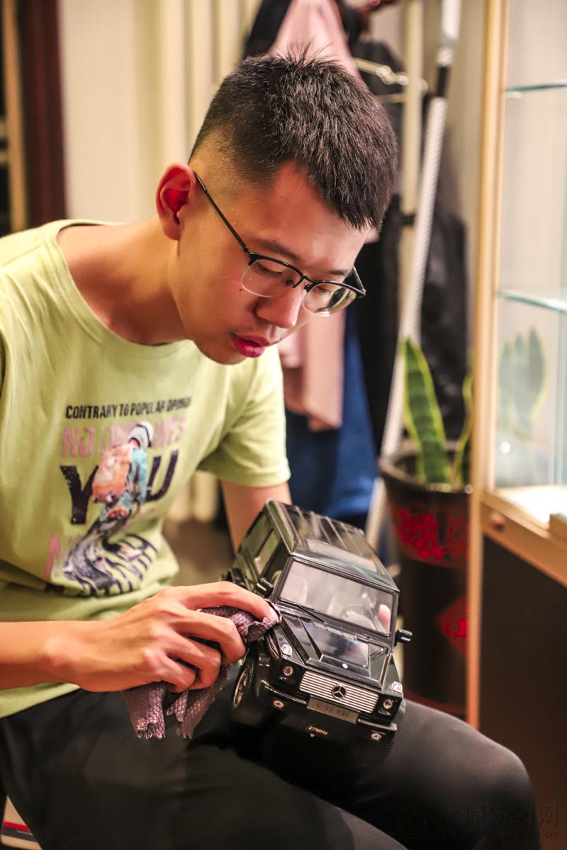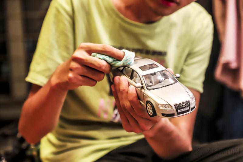 擦拭心愛的汽車車模型,是他日常喜歡做的事情之一。