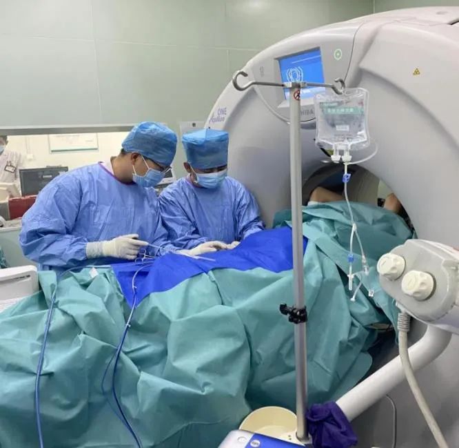 手術在局麻下進行,在CT的引導下,主治醫生將微波消融針精確定位穿刺進入腫瘤瘤體內,利用微波輻射天線發射電磁波,使極性分子快速旋轉摩擦產熱,致使腫瘤部位組織局部溫度瞬間升高而發生凝固壞死,起到消融腫瘤的目的。