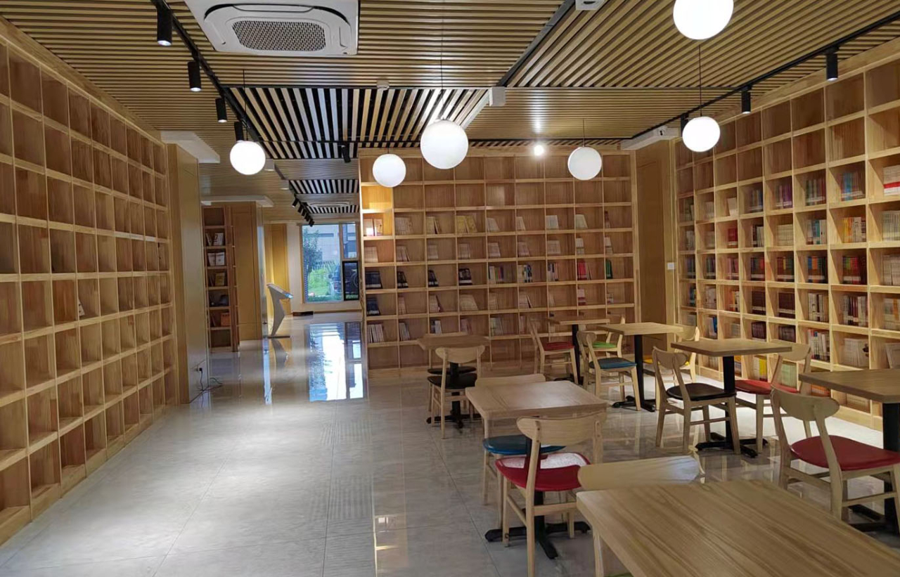 走進(jìn)中心一層的圖書室,木質(zhì)格柵的吊頂天花,與木質(zhì)書架、桌椅相呼應(yīng),轉(zhuǎn)角處設(shè)有水吧,讓人感覺走進(jìn)了溫馨的咖啡店。