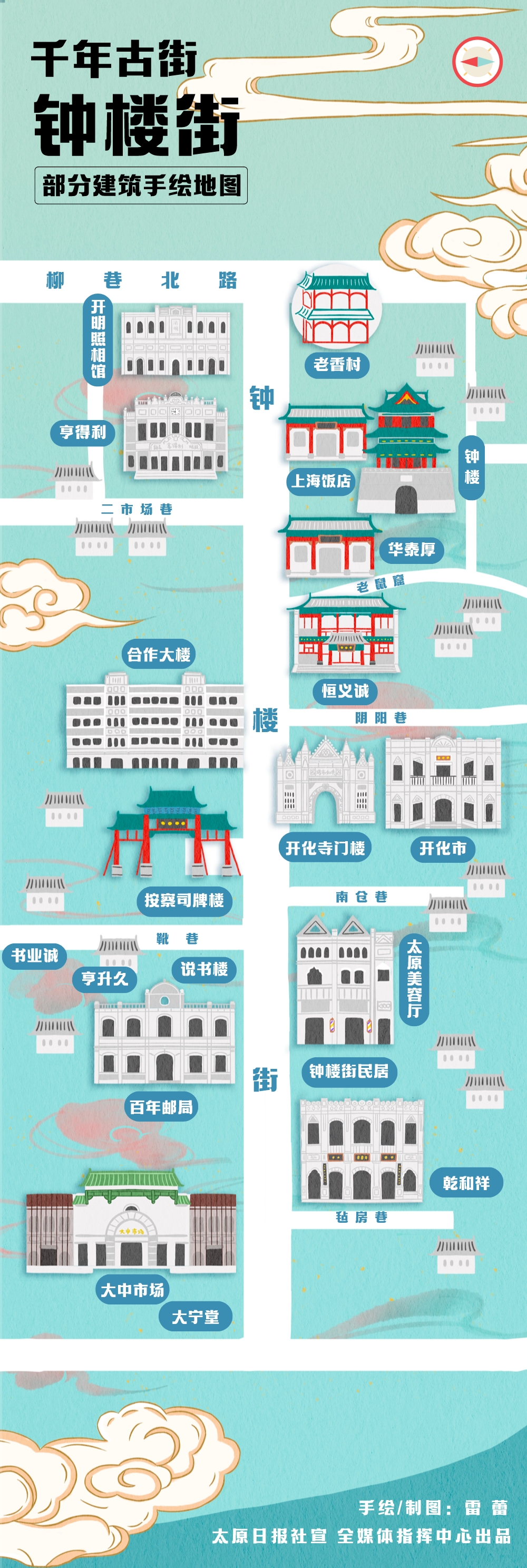 “不逛鐘樓柳巷,枉來太原一趟?!备脑旌蟮溺姌墙肿兂墒裁礃樱课羧盏睦献痔柖及岬搅四睦??小編查閱資料,跑遍鐘樓街,精心手繪了這幅鐘樓街游覽圖,對主要街巷和重要歷史建筑分布進行詳細描繪,通過手繪展現千年古街的嶄新面貌。還等什么,趕緊收藏!