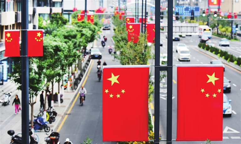 9月28日,西礦街上,園林工人正在安裝景觀“大花籃”。臨近國慶節,我市街頭巷尾處處洋溢著喜慶氛圍。