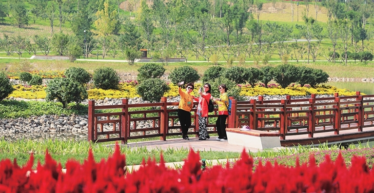 由于是工作日,開園首日并未出現(xiàn)過度“火爆”場面,這也正是將開園日期定在國慶節(jié)前一天的初衷。景區(qū)的第一批游客基本以有閑暇的退休人員為主,老年騎協(xié)的、廣場舞協(xié)會的……各種老年團體,足足有10多個,他們自發(fā)組織起來,穿著各自團隊統(tǒng)一的服裝,在新建成的濕地公園內(nèi)盡情暢游。